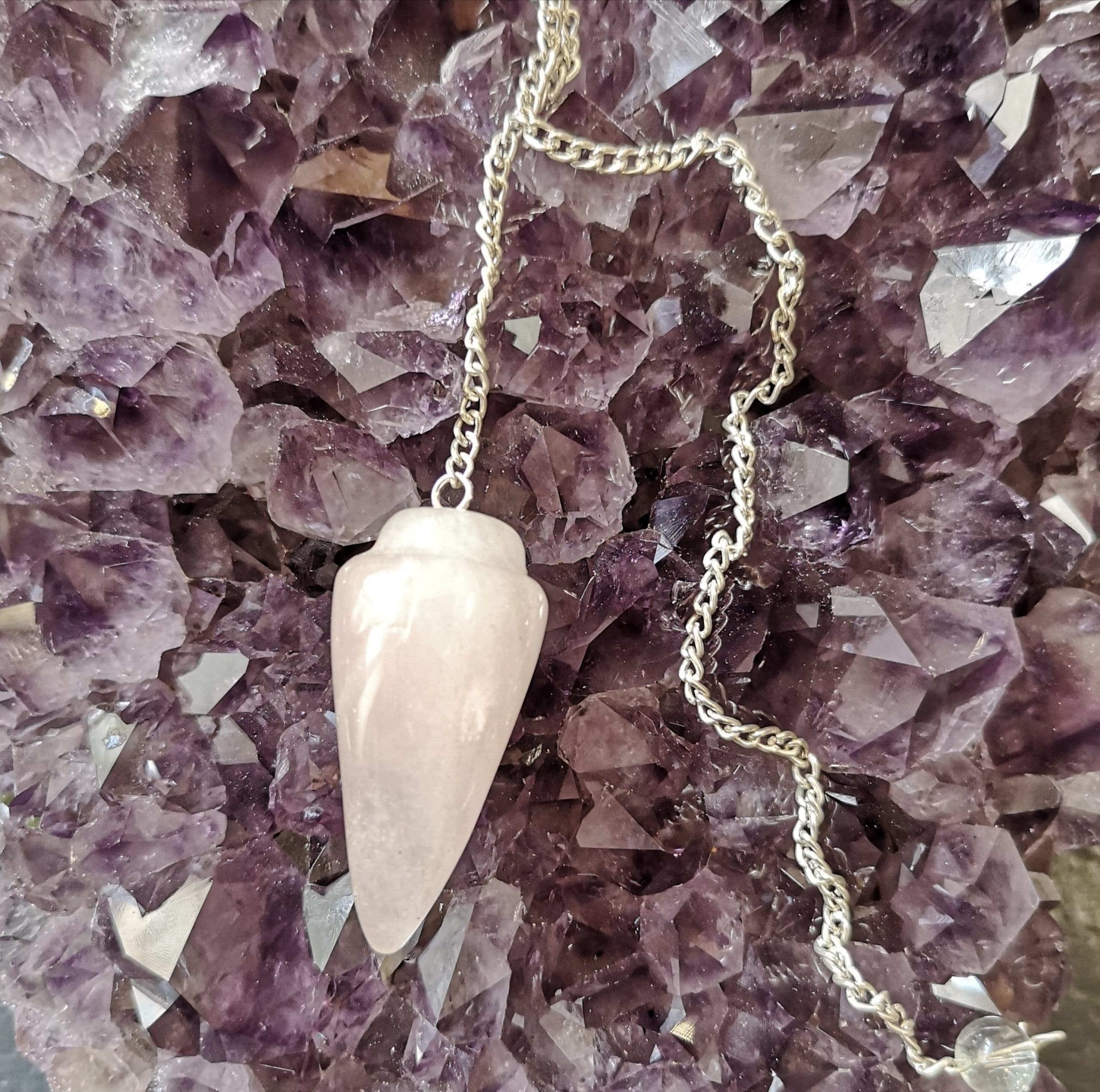Pendule Pointe Quartz rose . Chaîne de couleur argenté d’environ 170mm.