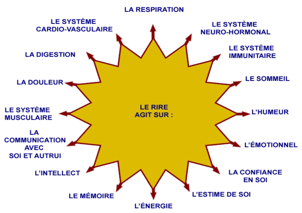 Le rire est l’un des remèdes les plus faciles, économiques et efficaces contre le stress. Il amène l’hypothalamus (situé à la base du cerveau) à sécréter des endorphines, aussi appelées «hormones du bonheur». Les endorphines apaisent le corps et apportent un bien-être en réduisant les excès d’adrénaline et de cortisol (hormone en jeu dans le stress). Le rire permet aussi de relâcher les muscles tendus et de libérer l’esprit de ses préoccupations.