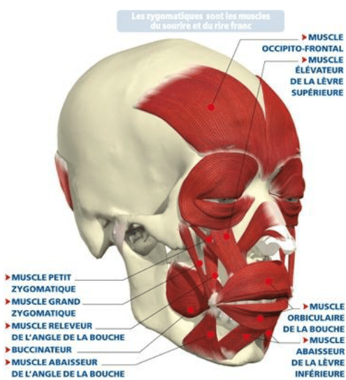 Les muscles activés lors du rire sont ceux du larynx par vocalisation, les muscles intercostaux, le diaphragme, les abdominaux et bien entendu, ceux du visage. Si environ trente muscles interviennent dans les expressions du visage (contrôle des mouvements des yeux, de la face et de la bouche), dix-sept entrent en jeu dans le sourire. Parmi eux, les grands maîtres du rire sont les muscles grands zygomatiques et petits zygomatiques. Le sourire sincère et le sourire forcé n’utilise pas les même muscles, ainsi, le sourire spontané utilise un muscle, orbicularis oculi, qui entoure l’œil et se contracte, il ne se contracte pas de manière volontaire, c’est d’ailleurs ce muscle qui crée les « pattes d’oie » aux coins des yeux. Le sourire sincère utilise également un autre muscle, le grand zygomatique, qui va étirer les coins de la bouche jusqu’aux oreilles.